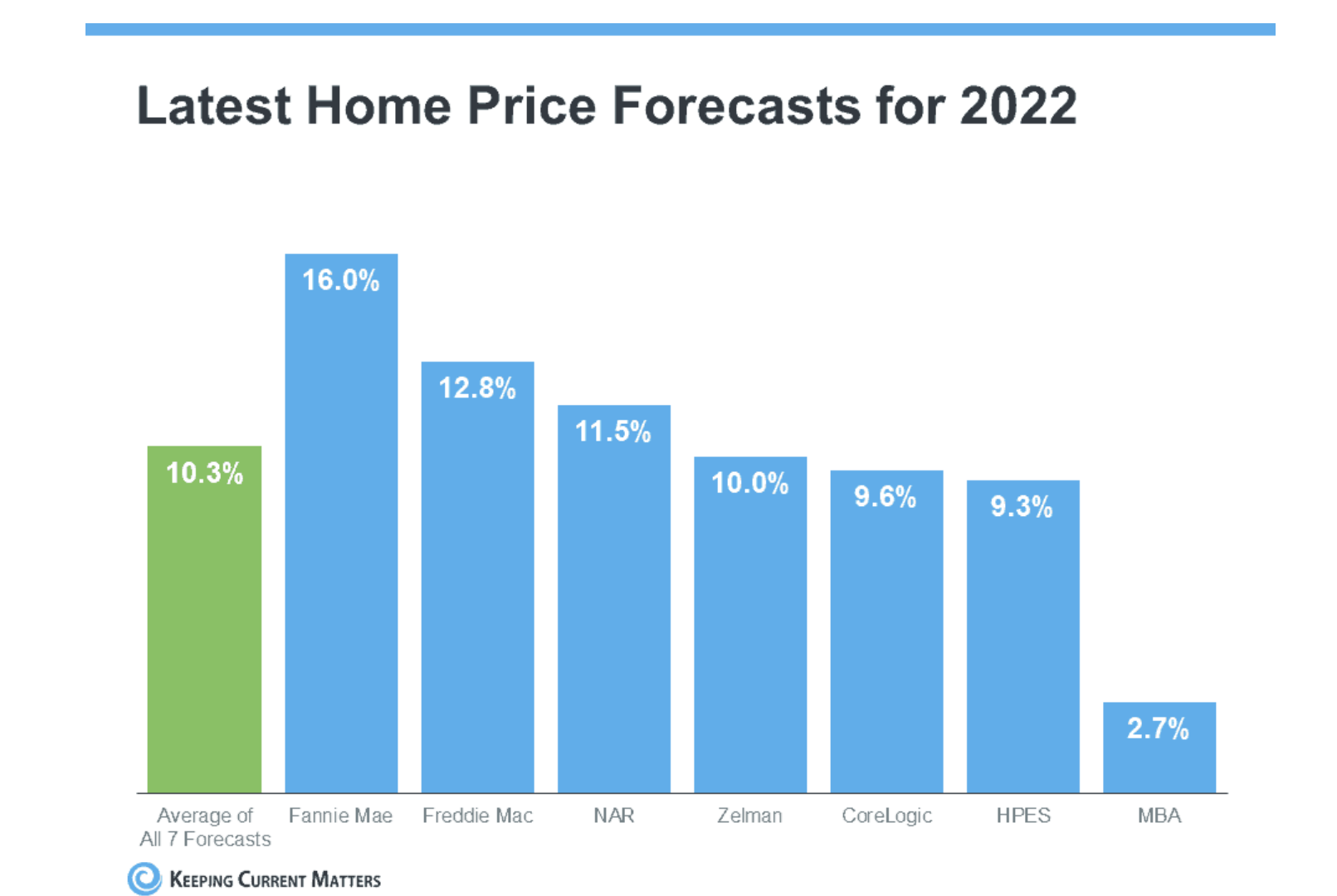 With rates rising, this has pushed out some buyers which is helping the market cool off a bit. Thus the shift we are beginning to see in some areas. Experts agree that homes are expected to appreciate another 10ish % — see below.